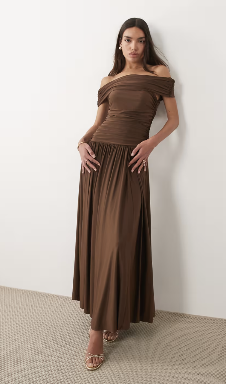 off the shoulder drop waist maxi dress in brown