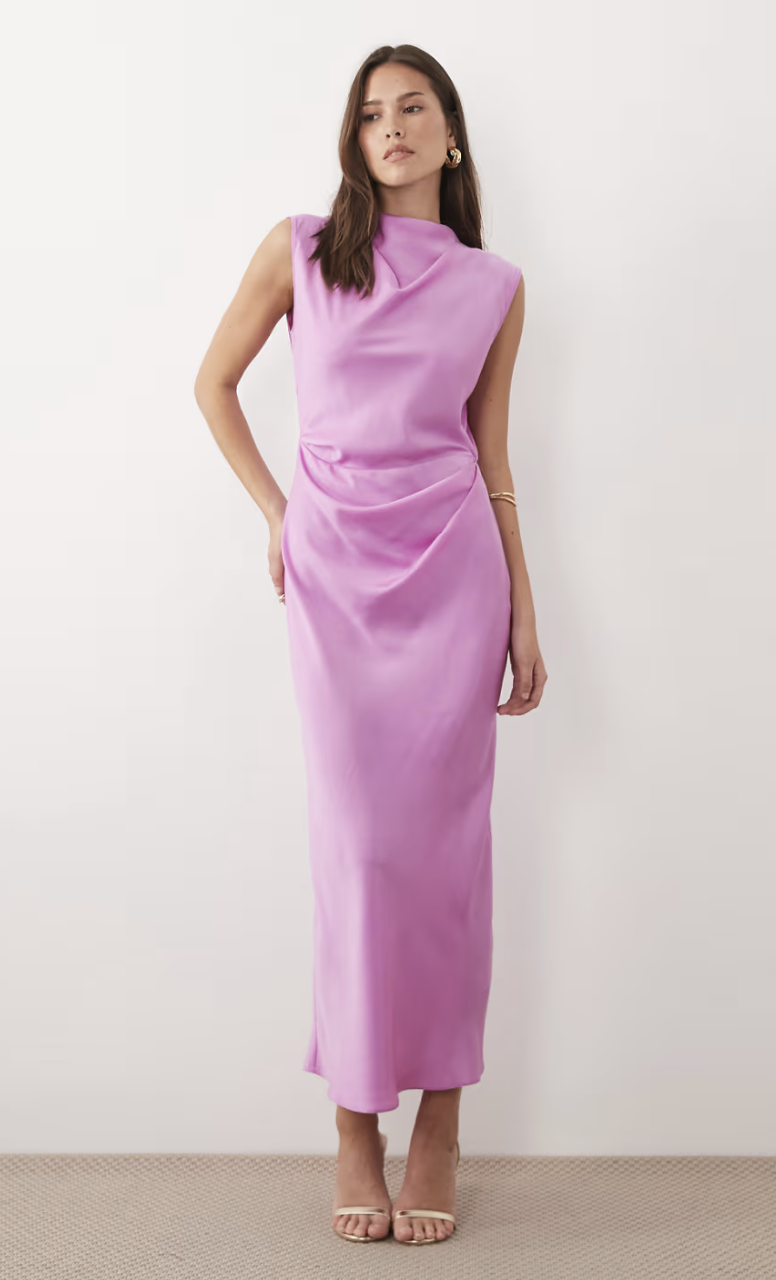 ASOS DESIGN satin high neck pleated bodice midaxi dress in pink lilac