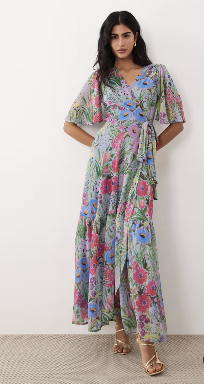 Hope & Ivy flutter sleeves wrap skirt tie waist maxi dress in lilac floral print